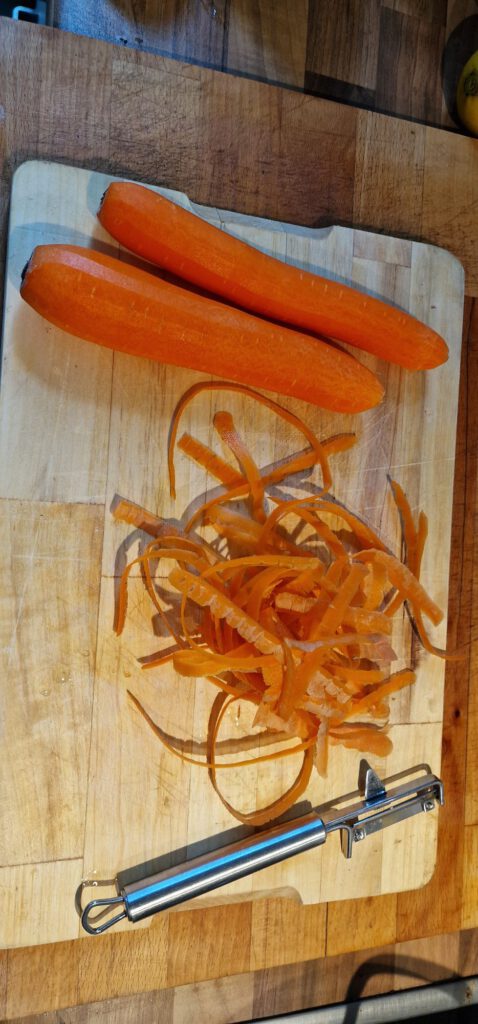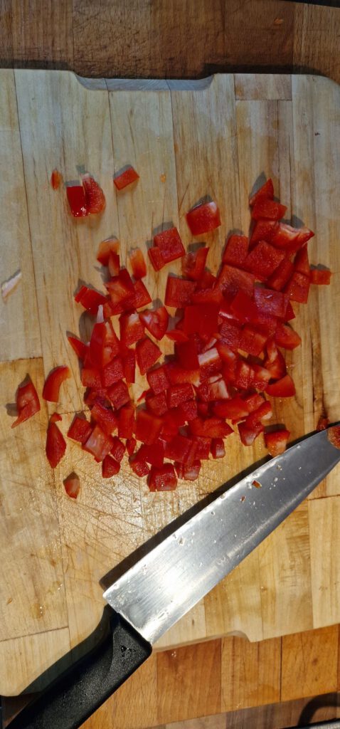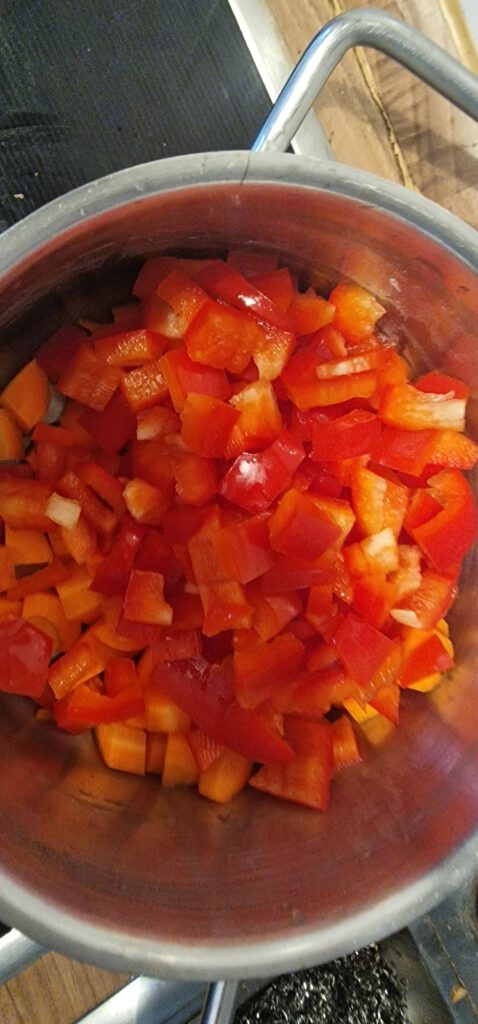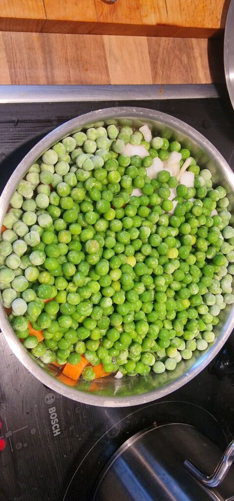 2 Rote Paprika, 1 Zwiebel, 300 g Erbsen & 300 g Karotten (in Würfel schneiden und 5–6 Min. bissfest dünsten)