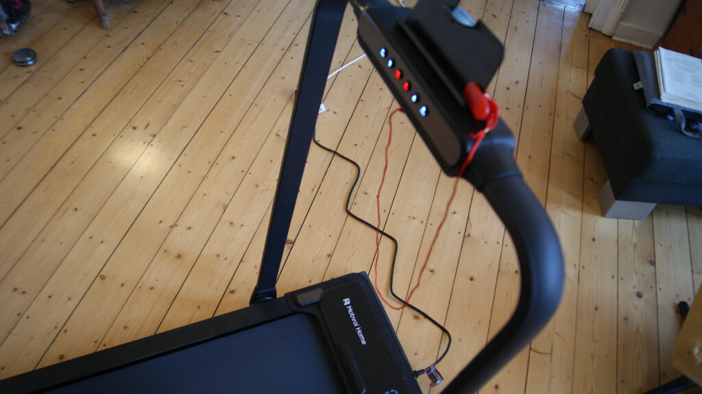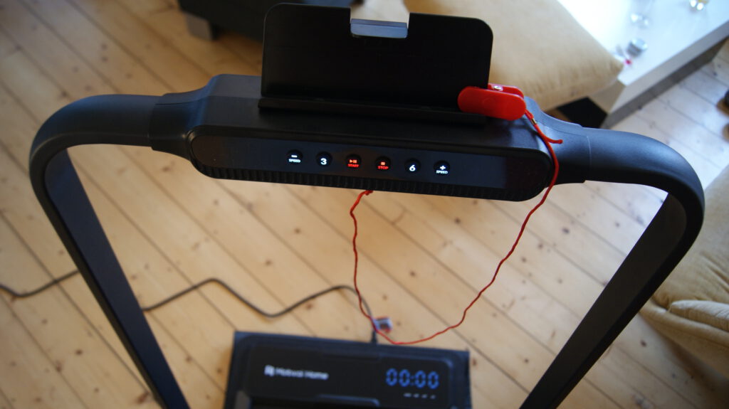Ein praktisches Detail ist die Halterung für Smartphones, die auch bei Vibrationen sicher hält. Sicherheit gibt es ebenfalls: Ein Clip am Hosenbund stoppt das Laufband sofort, wenn man das Gleichgewicht verliert.