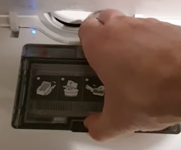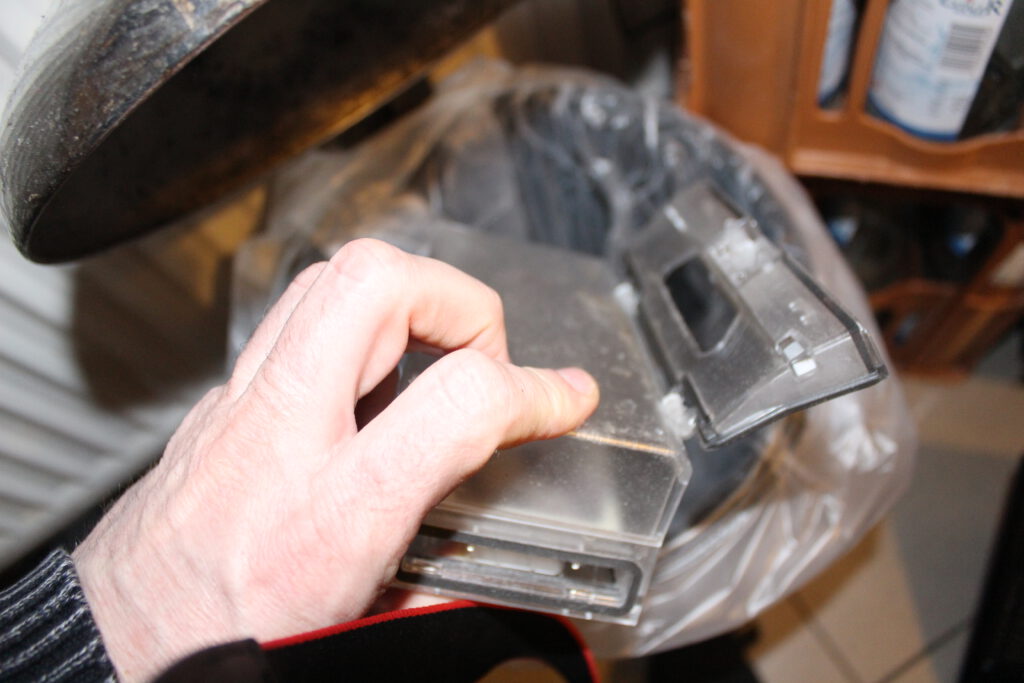 Der nächste Schritt ist das eigentliche Entleeren. Dazu öffnet man die Klappe am Staubbehälter und kippt den Inhalt aus. Klingt einfach, oder? Leider bleibt hier oft noch Staub hängen, der nicht so leicht herausrutscht.