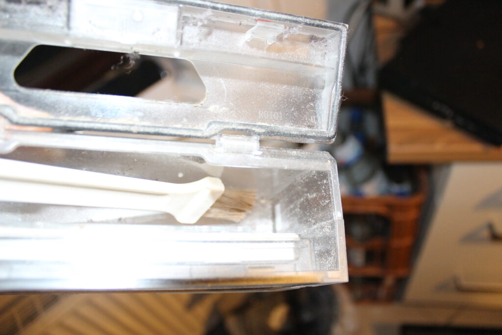 Hier kommt ein zusätzlicher Helfer ins Spiel: ein Pinsel. Mit einem Pinsel kann man die hartnäckigen Staubreste im Behälter entfernen. Ohne so ein Werkzeug wird es schwierig, denn versucht man es mit den Fingern, endet das schnell mit schmutzigen Händen – nicht gerade angenehm.